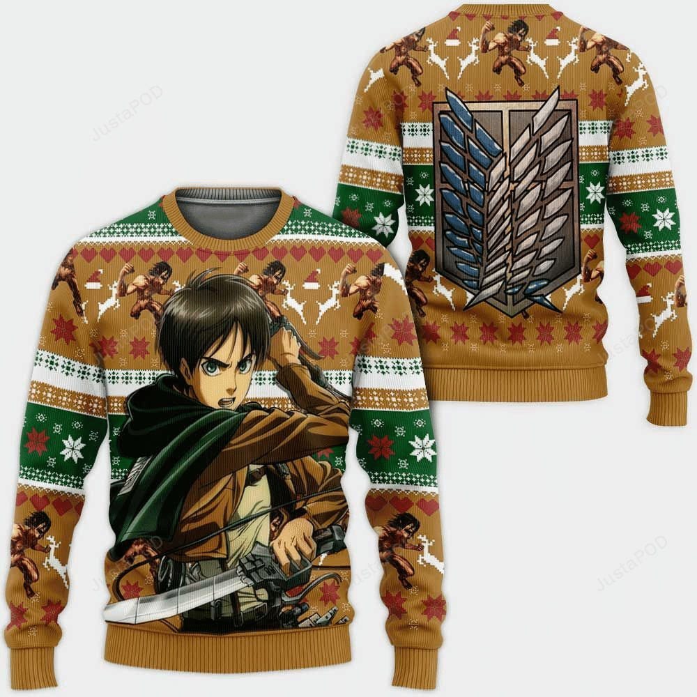 Get cozy and festive with our ugly Christmas sweater featuring Eren Yeager . Crafted from a premium blend of 95% Polyester and 5% Spandex, this soft, stretchy, and breathable sweater is perfect for holiday gatherings, parties, or casual wear. The advanced dye-sublimation printing ensures vibrant, long-lasting colors that won?t fade, crack, or peel. Its not just a sweater; its a statement piece that adds holiday vibes all season long. Surprise your loved ones with this unique and funny Christmas sweater!