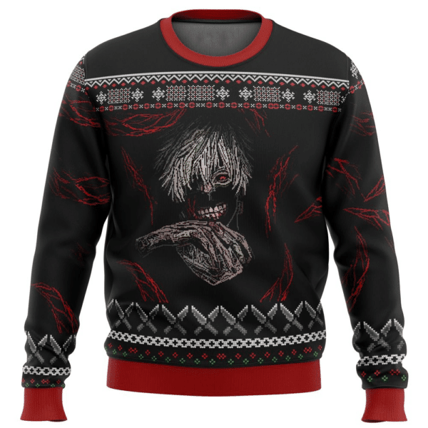 Get cozy and festive with our Ken Kaneki Tokyo Ghoul Ugly Christmas Sweater! Perfect for holiday gatherings or lounging in style. Made from a premium blend of 95% Polyester and 5% Spandex, this soft, stretchy, breathable sweater features vivid, long-lasting colors. Its not just clothing; its a statement piece that will keep holiday spirits high all season long! This funny holiday sweater will make a great gift for friends, family, or coworkers. Features dye-sublimation printing for bold, fade-resistant designs. Ideal for Ugly Sweater parties, Christmas events, family photos, or unique holiday gifting.