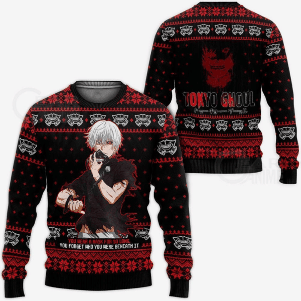 Get cozy, fun, and festive with our Ken Kaneki Tokyo Ghoul Ugly Sweater! Whether its an Ugly Sweater party, a family gathering, or a casual day at home, this premium blend sweater (95% Polyester, 5% Spandex) offers ultimate comfort. The advanced dye-sublimation printing ensures vibrant, long-lasting colors that resist fading, cracking, or peeling. Its not just clothing; its a statement piece embodying holiday cheer all season long. Surprise your loved ones with this unique and humorous Christmas sweater that lasts year after year. Perfect for Ugly Sweater parties, family photos, or as a playful holiday gift.