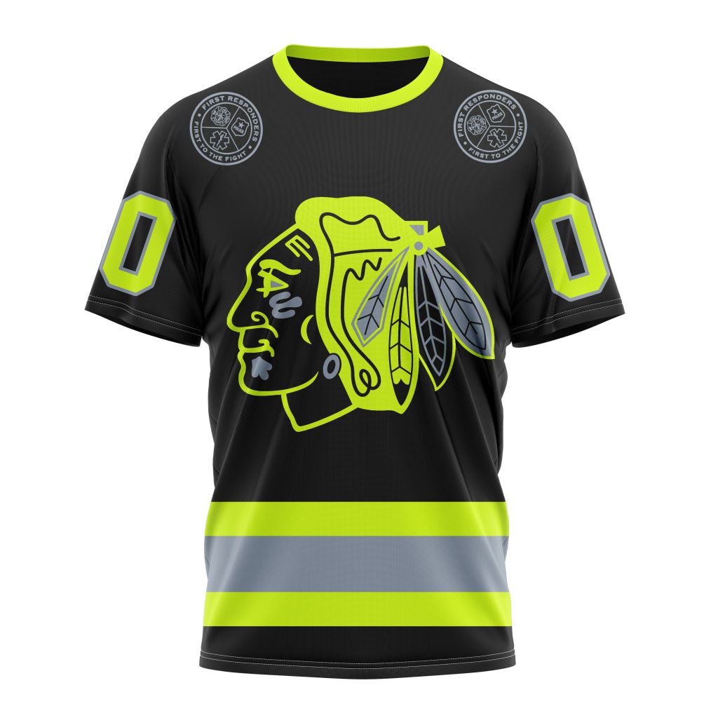 Chicago BlackHawks Unisex Kits With FireFighter Uniforms Color Personalized Name And Number T-Shirt