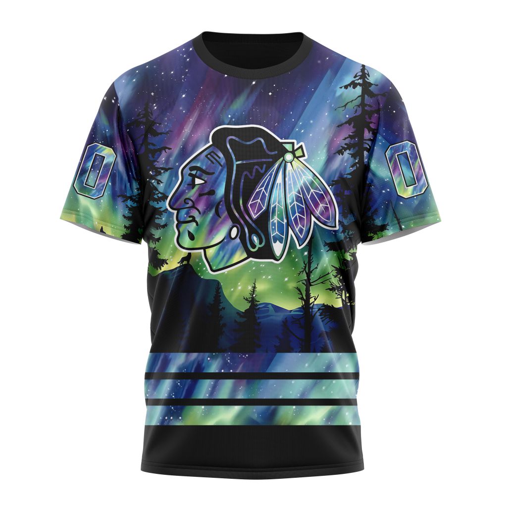 Chicago Blackhawks With Northern Lights 01 Personalized Name And Number T-Shirt