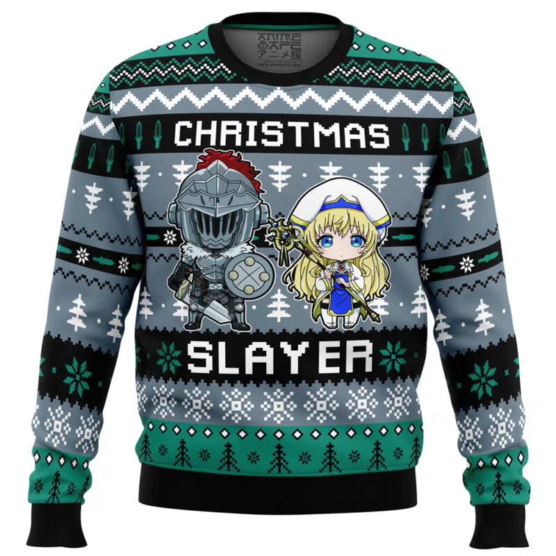 Buildercar – Christmas Slayer Goblin Slayer Ugly Christmas Sweater Turn Heads This Holiday with Anime Ape’s Exclusive Ugly Christmas Sweater