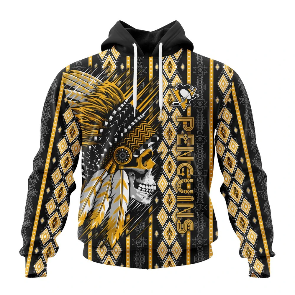 NHL Pittsburgh Penguins Awesome Skull Native Design Custom Name and Number Hoodie