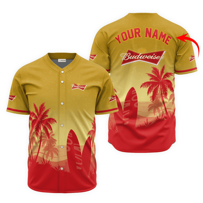 Personalized Budweiser Beer Palm Tree Surfboard Baseball Jersey