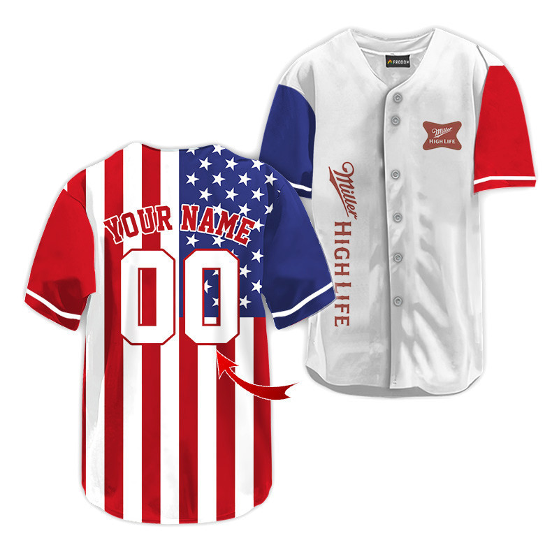 Personalized Miller High Life USA Flag Fourth Of July Baseball Jersey
