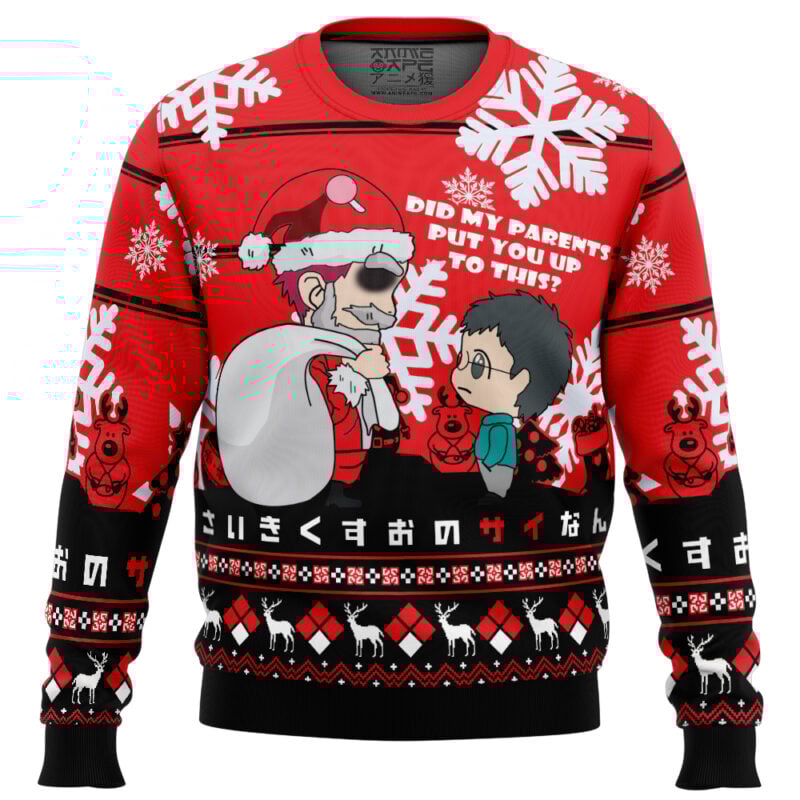 Buildercar – Santa Saiki The Desastrous Life of Saiki K. Ugly Christmas Sweater Turn Heads This Holiday with Anime Ape’s Exclusive Ugly Christmas Sweater