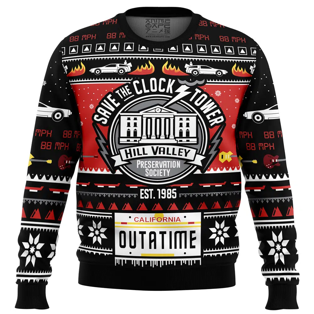 Buildercar – Save The Clock Tower Back To The Future Ugly Christmas Sweater Turn Heads This Holiday with Anime Ape’s Exclusive Ugly Christmas Sweater