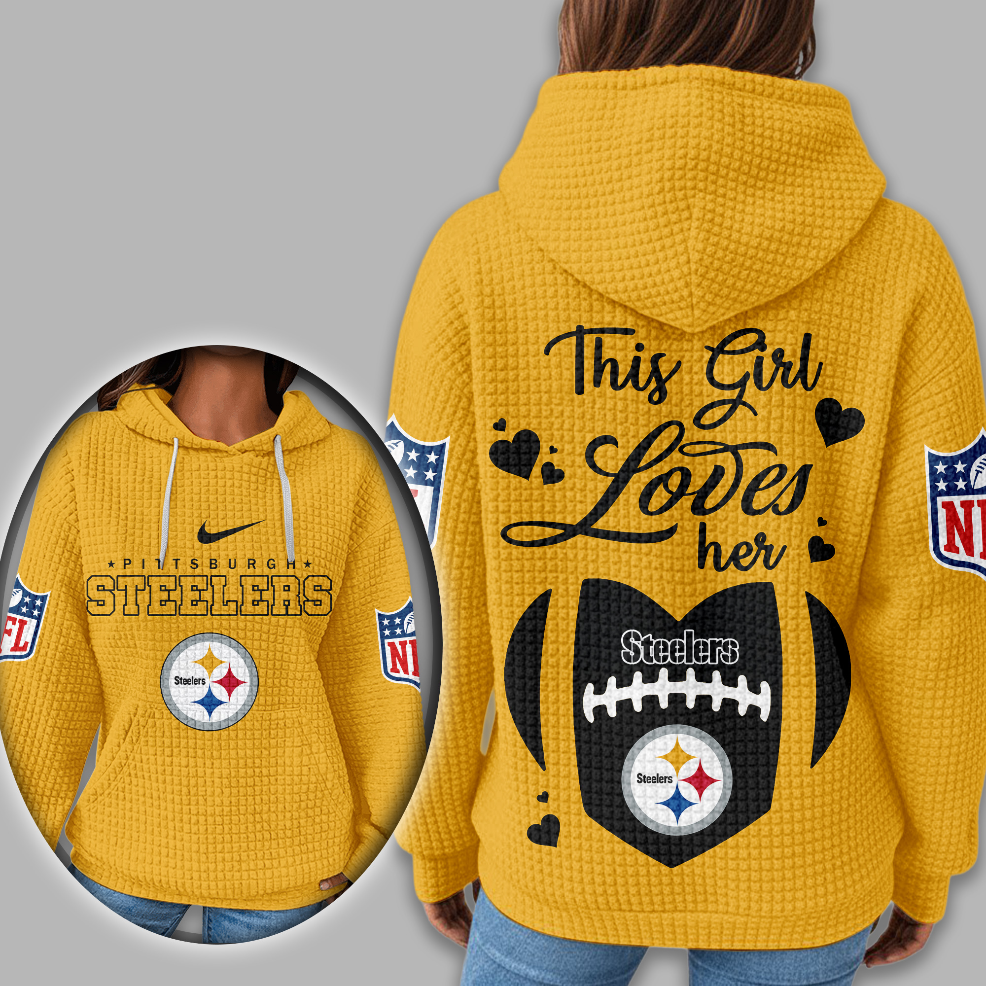 ?? Lovingly Crafted for True Football Fans Made from a premium Polyester + Spandex blend (250g corn-kernel waffle texture), this Waffle Hoodie delivers lightweight comfort, breathability, and a soft stretch that feels as good as game-day victory. Cozy, flexible, and built for all-day wear — from tailgates to couch touchdowns. ?? Game-Day Style Meets Everyday Comfort Designed with a textured waffle knit, adjustable hood with drawstring, and a spacious front pocket — perfect for keeping your hands warm during those chilly fourth quarters. The relaxed, oversized fit lets you rep your team spirit in total comfort and effortless style. ?? Your New Favorite Sweatshirt — On or Off the Field Pair it with jeans and boots for a laid-back fan look, or throw it over leggings for a cozy casual vibe. Whether you’re cheering from the stands, watching from home, or running errands, this hoodie blends fandom + fashion perfectly.